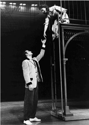 Larry Kert and Carol Lawrence singing "Tonight" in the famous balcony scene from West Side Story.